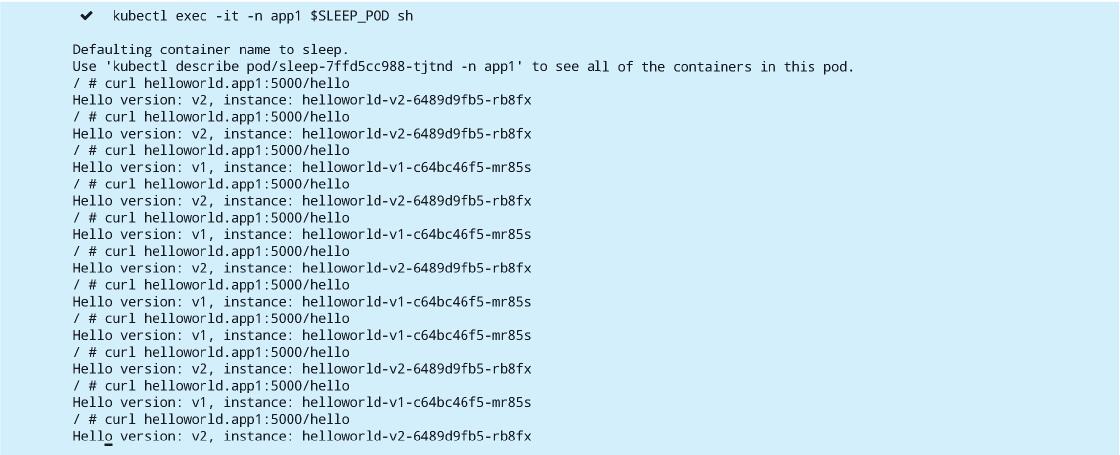 kubectl create namespace app1 kubectl label namespace app1 istio-injection=enabled kubectl apply -n app1 -f samples/helloworld/service.yaml kubectl apply -n app1 -f samples/helloworld/helloworld.yaml -l version=v2