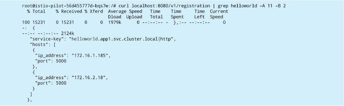 3)登录到命名空间istio-system下的istio-pilot容器中,运行curl localhost:8080/v1/registration|grep helloworld-A 11-B 2命令,如果得到如下类似的结果就说明版本v1与v2的helloworld服务都已经注册到Istio控制平面中了: