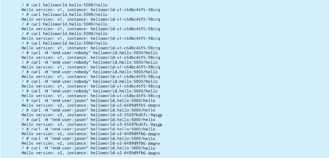 kubectl create namespace hello kubectl label namespace hello istio-injection=enabled kubectl apply -n hello -f samples/helloworld/service.yaml kubectl apply -n hello -f samples/helloworld/helloworld.yaml -l version=v2 kubectl apply -n hello -f samples/helloworld/helloworld.yaml -l version=v3