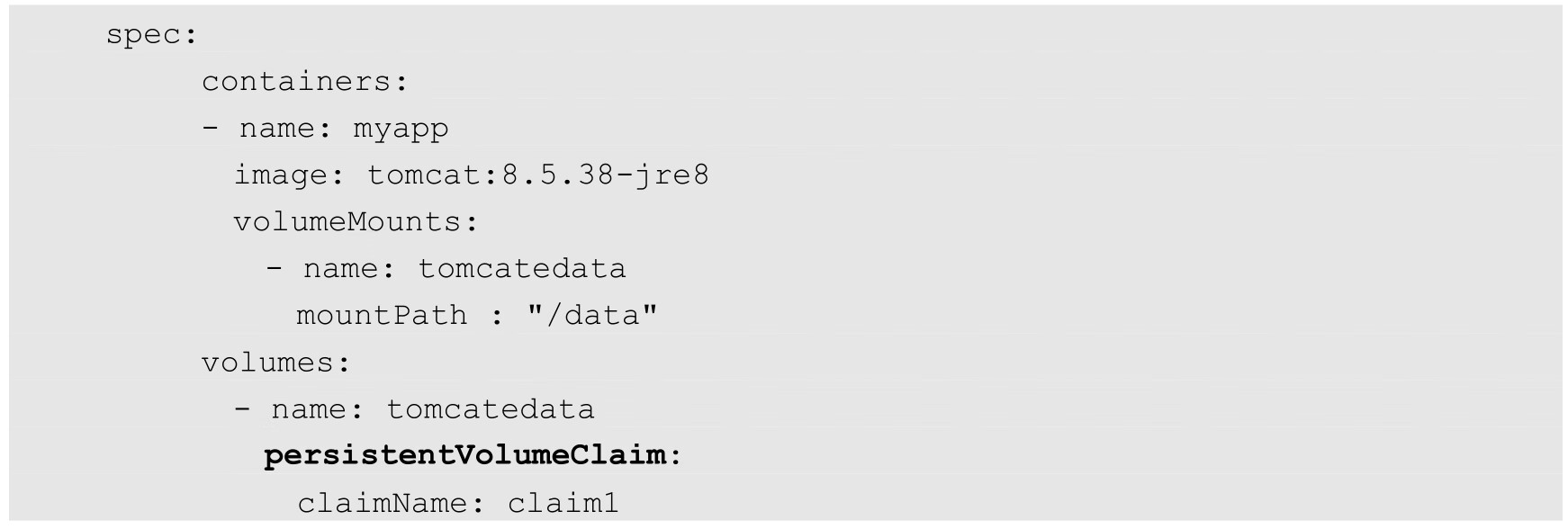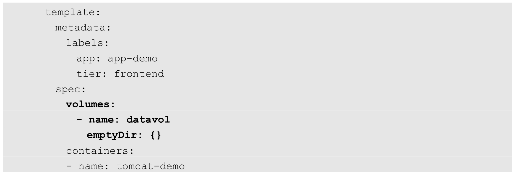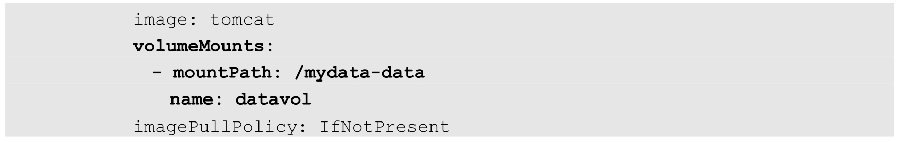 Volume的使用也比较简单,在大多数情况下,我们先在Pod上声明一个Volume,然后在容器里引用该Volume并将其挂载(Mount)到容器里的某个目录下。举例来说,若我们要给之前的Tomcat Pod增加一个名为datavol的Volume,并将其挂载到容器的/mydata-data目录下,则只对Pod的定义文件做如下修正即可(代码中的粗体部分):