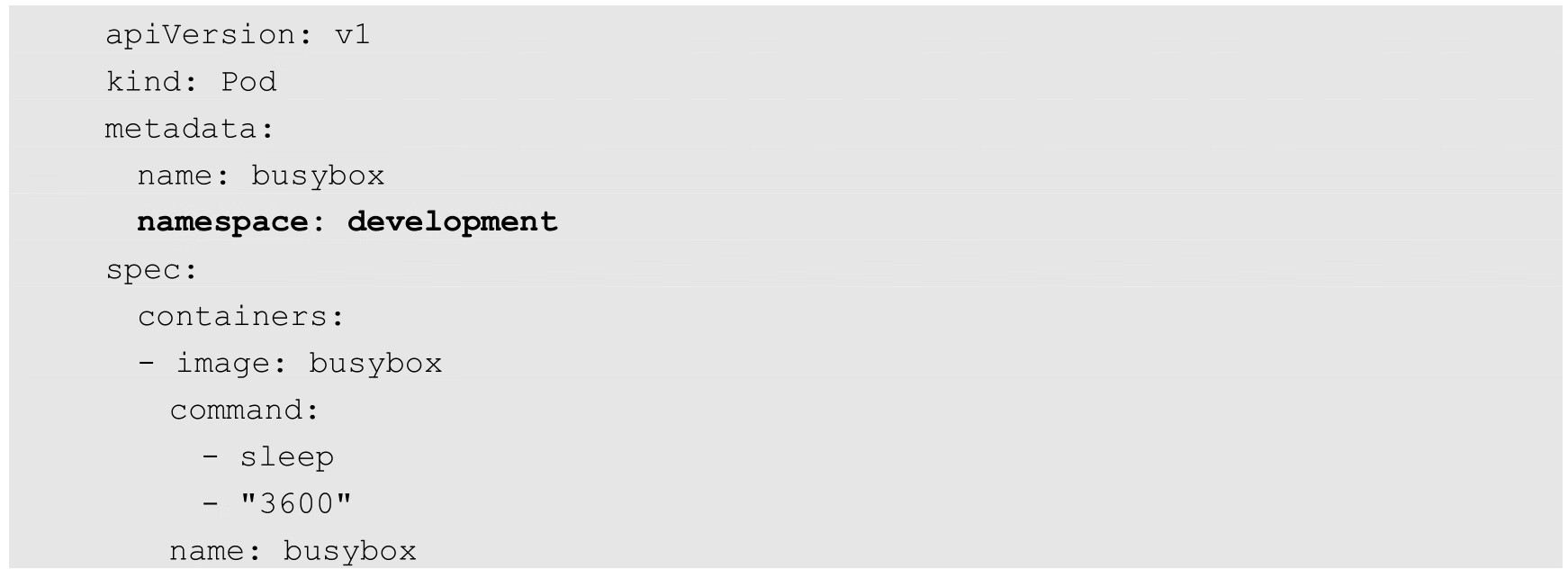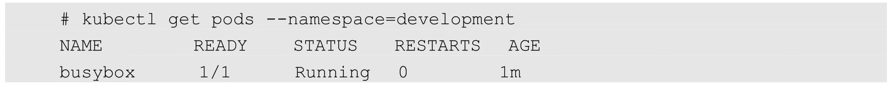 一旦创建了命名空间,我们在创建资源对象时就可以指定这个资源对象属于哪个命名空间。比如在下面的例子中定义了一个名为busybox的Pod,并将其放入development这个命名空间中: