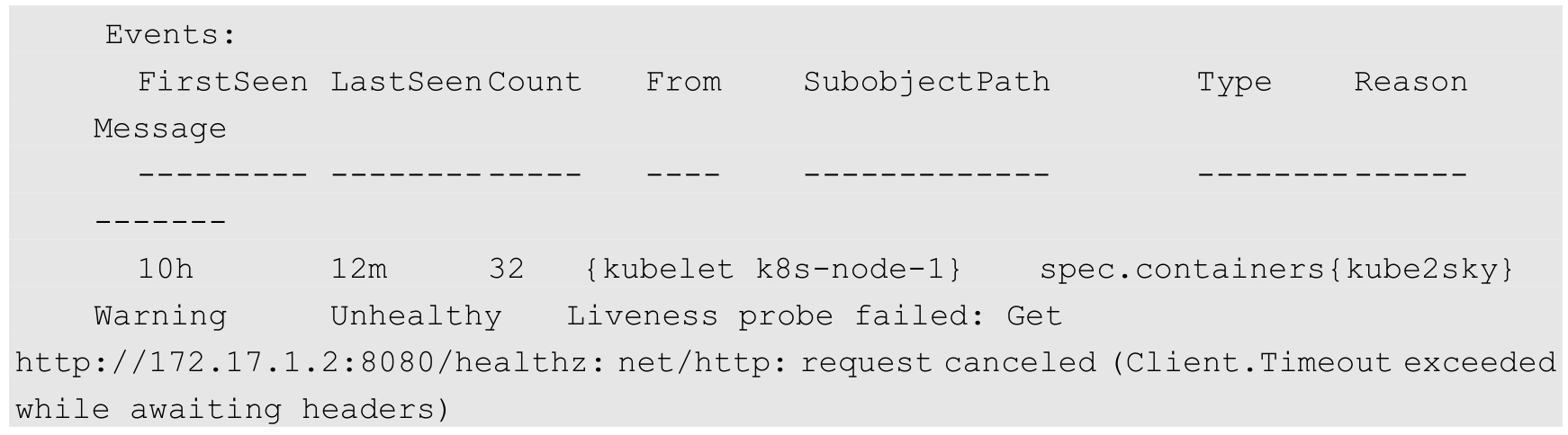 这里顺便提一下Kubernetes的Event概念。Event是一个事件的记录,记录了事件的最早产生时间、最后重现时间、重复次数、发起者、类型,以及导致此事件的原因等众多信息。Event通常会被关联到某个具体的资源对象上,是排查故障的重要参考信息。之前我们看到在Node的描述信息中包括Event,而Pod同样有Event记录,当我们发现某个Pod迟迟无法创建时,可以用kubectl describe pod xxxx来查看它的描述信息,以定位问题的成因。比如下面这个Event记录信息就表明Pod里的一个容器被探针检测为失败一次: