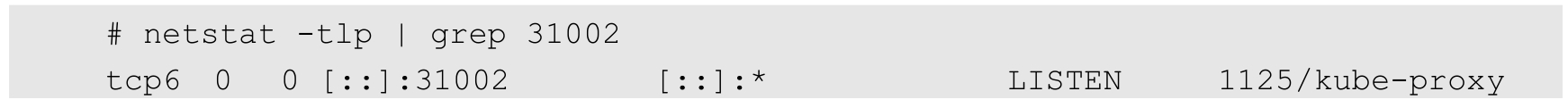 NodePort的实现方式是,在Kubernetes集群的每个Node上都为需要外部访问的Service开启一个对应的TCP监听端口,外部系统只要用任意一个Node的IP地址+NodePort端口号即可访问此服务,在任意Node上运行netstat命令,就可以看到有NodePort端口被监听: