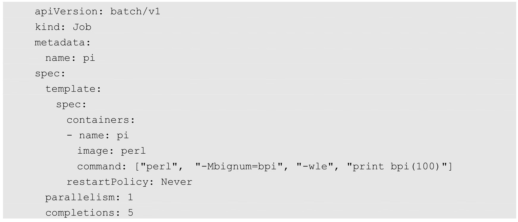 除了无状态服务、有状态集群、常见的第三种应用,还有批处理应用。批处理应用的特点是一个或多个进程处理一组数据(图像、文件、视频等),在这组数据都处理完成后,批处理任务自动结束。为了支持这类应用,Kubernetes引入了新的资源对象——Job,下面是一个计算圆周率的经典例子: