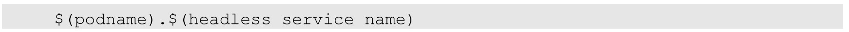 比如一个3节点的Kafka的StatefulSet集群对应的Headless Service的名称为kafka,StatefulSet的名称为kafka,则StatefulSet里3个Pod的DNS名称分别为kafka-0.kafka、kafka-1.kafka、kafka-2.kafka,这些DNS名称可以直接在集群的配置文件中固定下来。