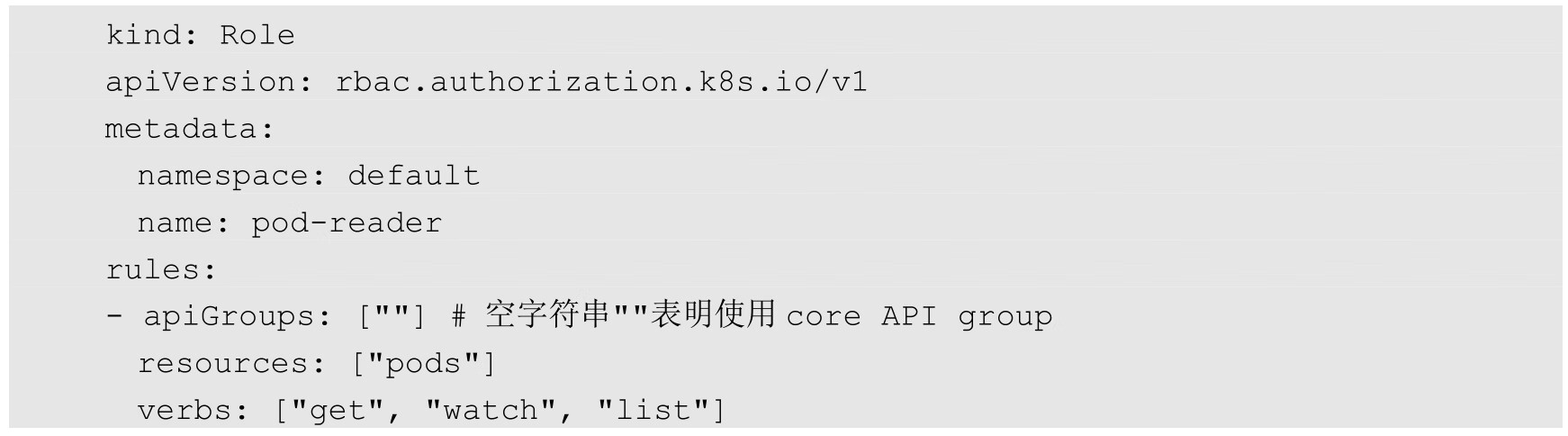 首先我们要学习的是Role这个资源对象,包括Role与ClusterRole两种类型的角色。角色定义了一组特定权限的规则,比如可以操作某类资源对象。局限于某个命名空间的角色由Role对象定义,作用于整个Kubernetes集群范围内的角色则通过ClusterRole对象定义。下面是Role的一个例子,表示在命名空间default中定义一个Role对象,用于授予对Pod资源的读访问权限,绑定到该Role的用户则具有对Pod资源的get、watch和list权限: