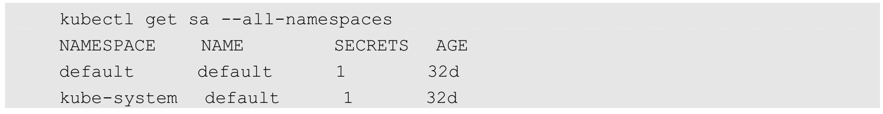 在默认情况下,Kubernetes在每个命名空间中都会创建一个默认的名称为default的Service Account,因此Service Account是不能全局使用的,只能被它所在命名空间中的Pod使用。通过以下命令可以查看集群中的所有Service Account: