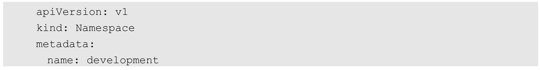 命名空间的定义很简单,如下所示的YAML文件定义了名为development的命名空间: