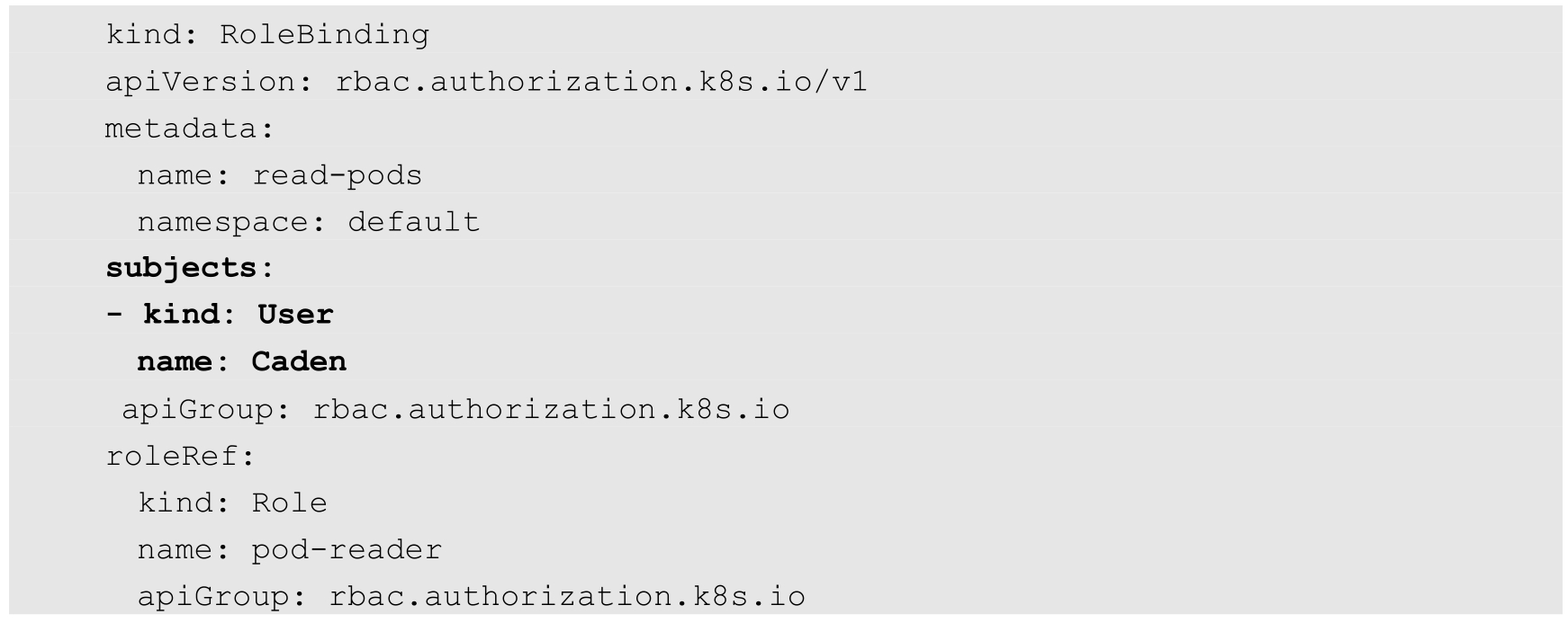 接下来就是如何将Role与具体用户绑定(用户授权)的问题了。我们可以通过RoleBinding与ClusterRoleBinding来解决这个问题。下面是一个具体的例子,在命名空间default中将“pod-reader”角色授予用户“Caden”,结合对应的Role的定义,表明这一授权将允许用户“Caden”从命名空间default中读取pod。