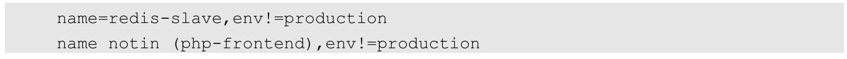 可以通过多个Label Selector表达式的组合来实现复杂的条件选择,多个表达式之间用“,”进行分隔即可,几个条件之间是“AND”的关系,即同时满足多个条件,比如下面的例子: