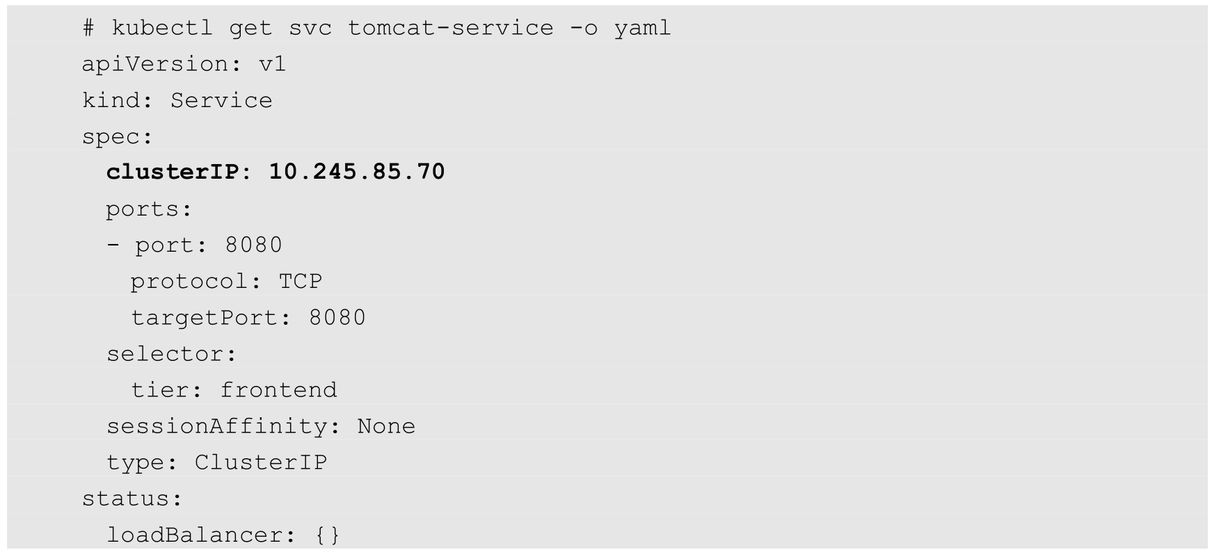 你可能有疑问:“说好的Service的ClusterIP地址呢?怎么没有看到?”运行下面的命令即可看到tomcat-service被分配的ClusterIP地址及更多的信息: