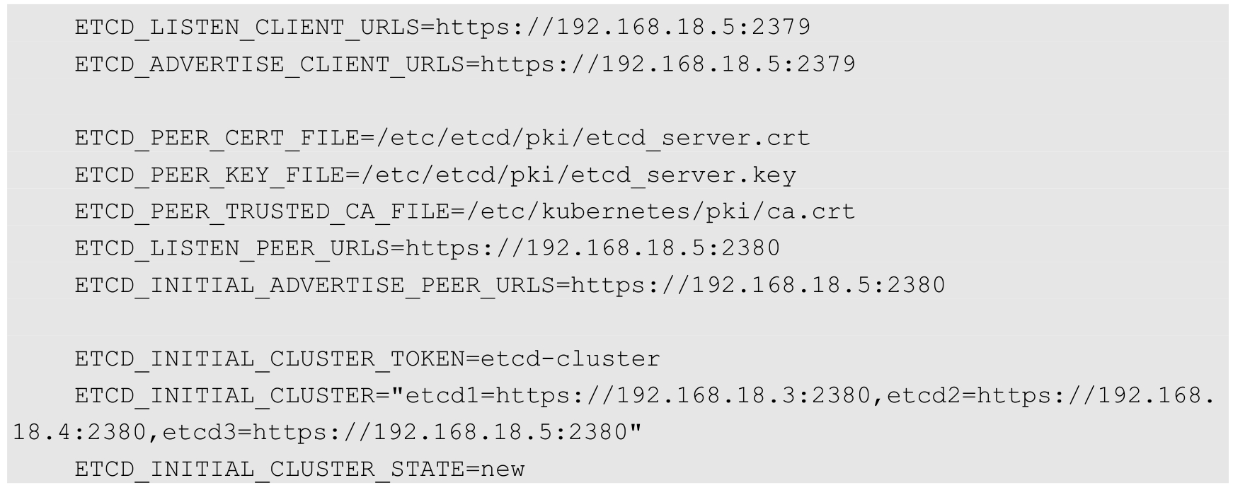 ◎ ETCD_LISTEN_PEER_URLS和ETCD_INITIAL_ADVERTISE_PEER_URLS:为本集群其他节点提供的服务监听URL地址,例如https://192.168.18.3:2380。