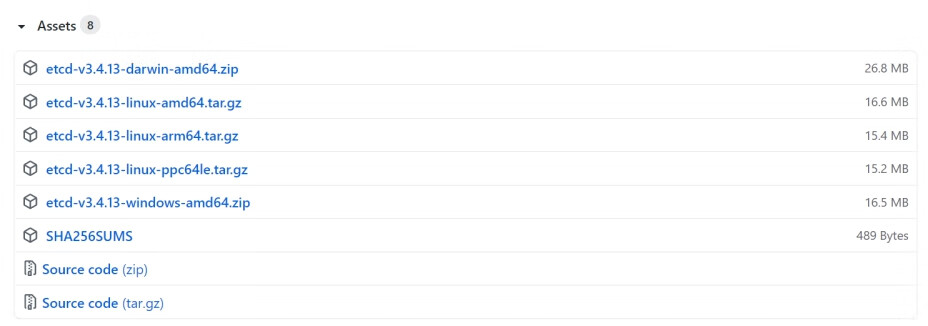 从GitHub官网下载etcd二进制文件,例如etcd-v3.4.13-linux-amd64.tar.gz,如图2.2所示。