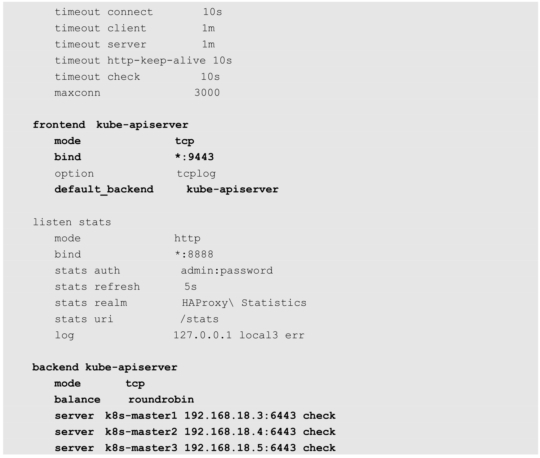 ◎ backend:后端3个kube-apiserver的地址,以IP:Port方式表示,例如192.168.18.3:6443、192.168.18.4:6443和192.168.18.5:6443;mode字段用于设置协议,此处为tcp;balance字段用于设置负载均衡策略,例如roundrobin为轮询模式。