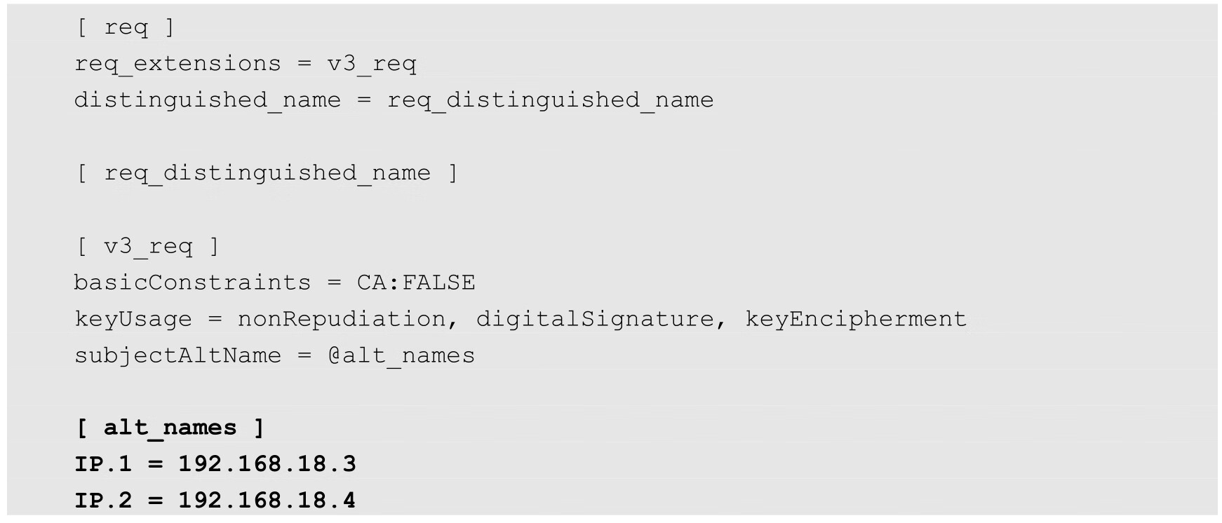 先创建一个x509 v3配置文件etcd_ssl.cnf,其中subjectAltName参数(alt_names)包括所有etcd主机的IP地址,例如: