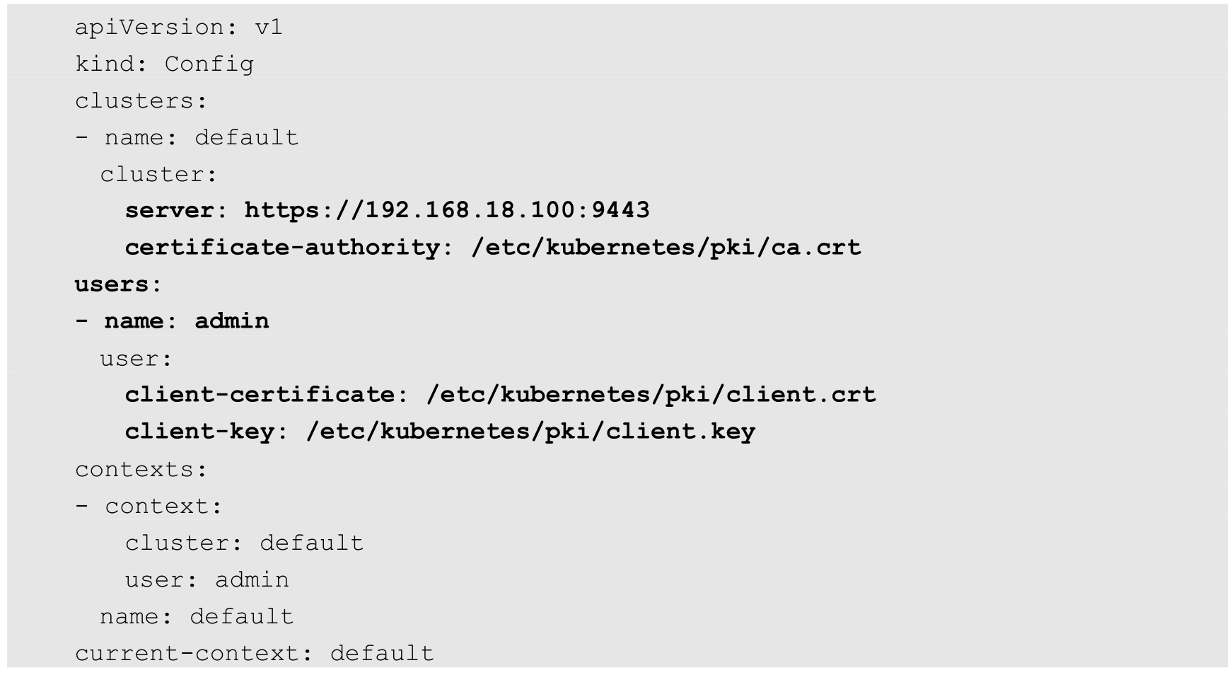 在Kubeconfig文件中主要设置访问kube-apiserver的URL地址及所需CA证书等的相关参数,示例如下:
