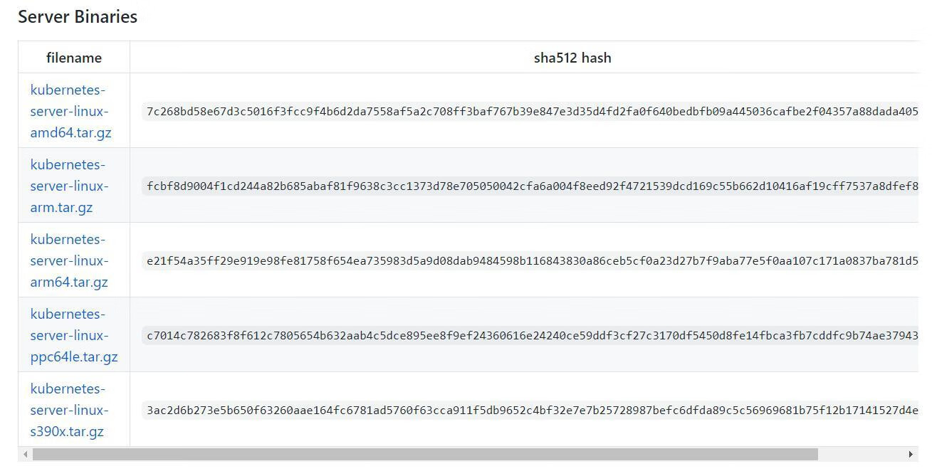 在压缩包kubernetes.tar.gz内包含了Kubernetes的全部服务二进制文件和容器镜像文件,也可以分别下载Server Binaries和Node Binaries二进制文件。在Server Binaries中包含不同系统架构的服务端可执行文件,例如kubernetes-server-linux-amd64.tar.gz文件包含了x86架构下Kubernetes需要运行的全部服务程序文件;Node Binaries则包含了不同系统架构、不同操作系统的Node需要运行的服务程序文件,包括Linux版和Windows版等。