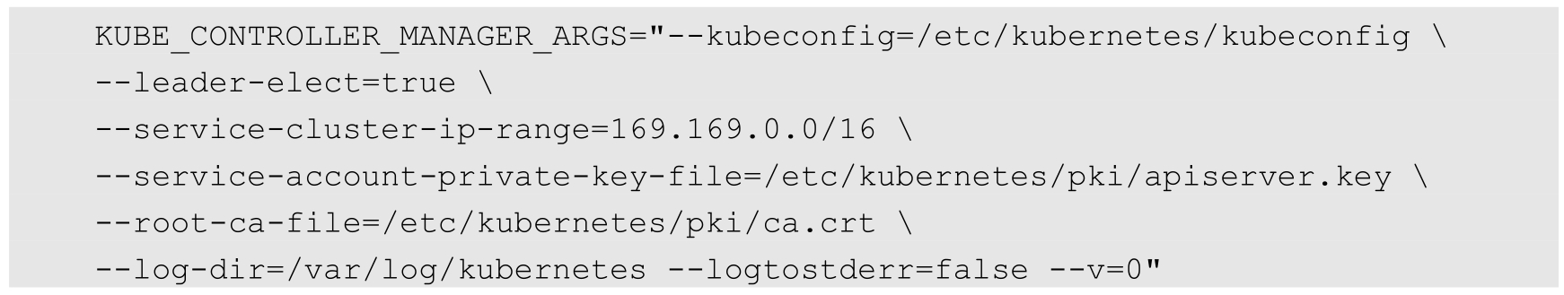 (2)配置文件/etc/kubernetes/controller-manager的内容为通过环境变量KUBE_CONTROLLER_MANAGER_ARGS设置的kube-controller-manager的全部启动参数,包含CA安全配置的启动参数示例如下: