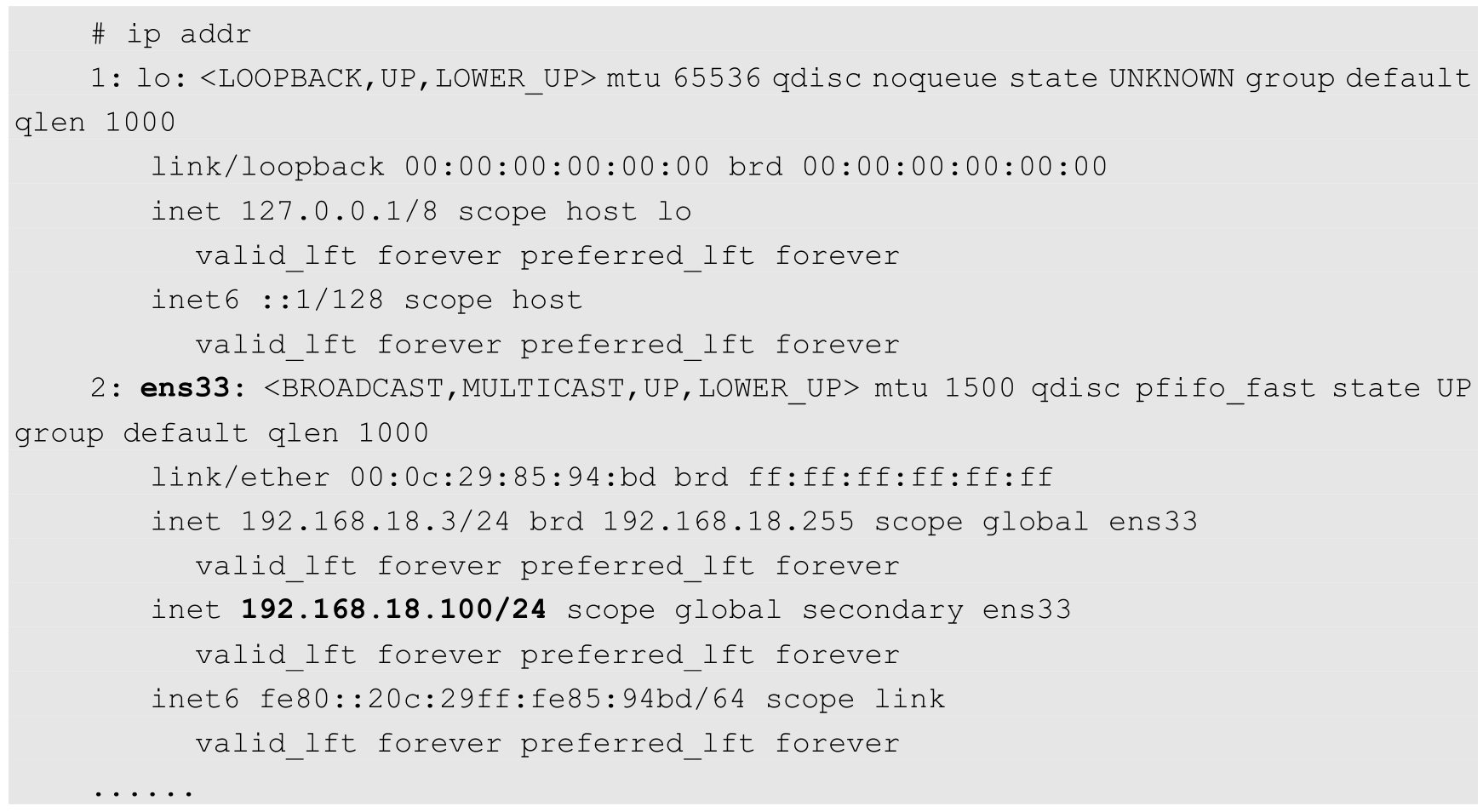 通过ip addr命令查看服务器192.168.18.3的IP地址信息,可以看到在ens33网卡上新增了192.168.18.100地址:
