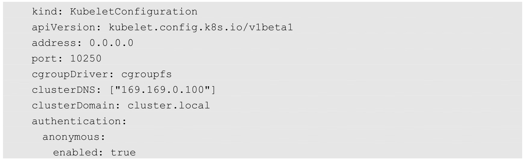 ◎ --config:kubelet配置文件,从Kubernetes 1.10版本开始引入,设置可以让多个Node共享的配置参数,例如address、port、cgroupDriver、clusterDNS、clusterDomain等。关于kubelet.config文件中可以设置的参数内容和详细说明,请参见官方文档的说明。