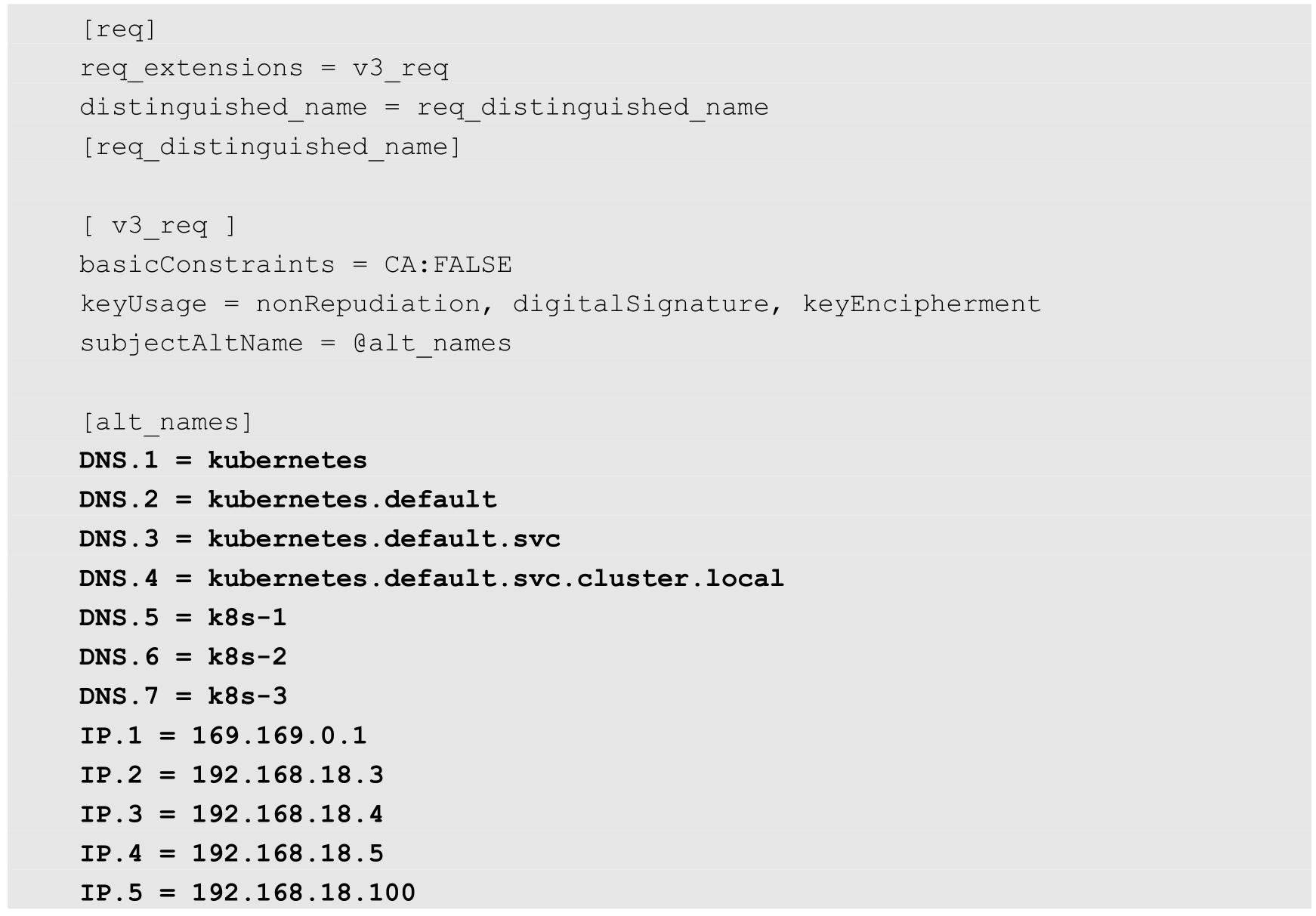 在该文件中主要需要在subjectAltName字段([alt_names])设置Master服务的全部域名和IP地址,包括: