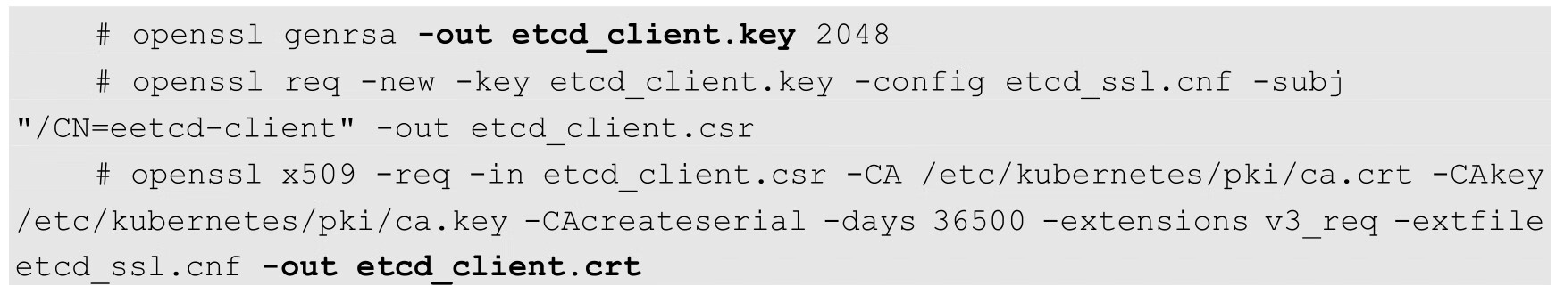 再创建客户端使用的CA证书,包括etcd_client.key和etcd_client.crt文件,也将其保存到/etc/etcd/pki目录下,后续供kube-apiserver连接etcd时使用: