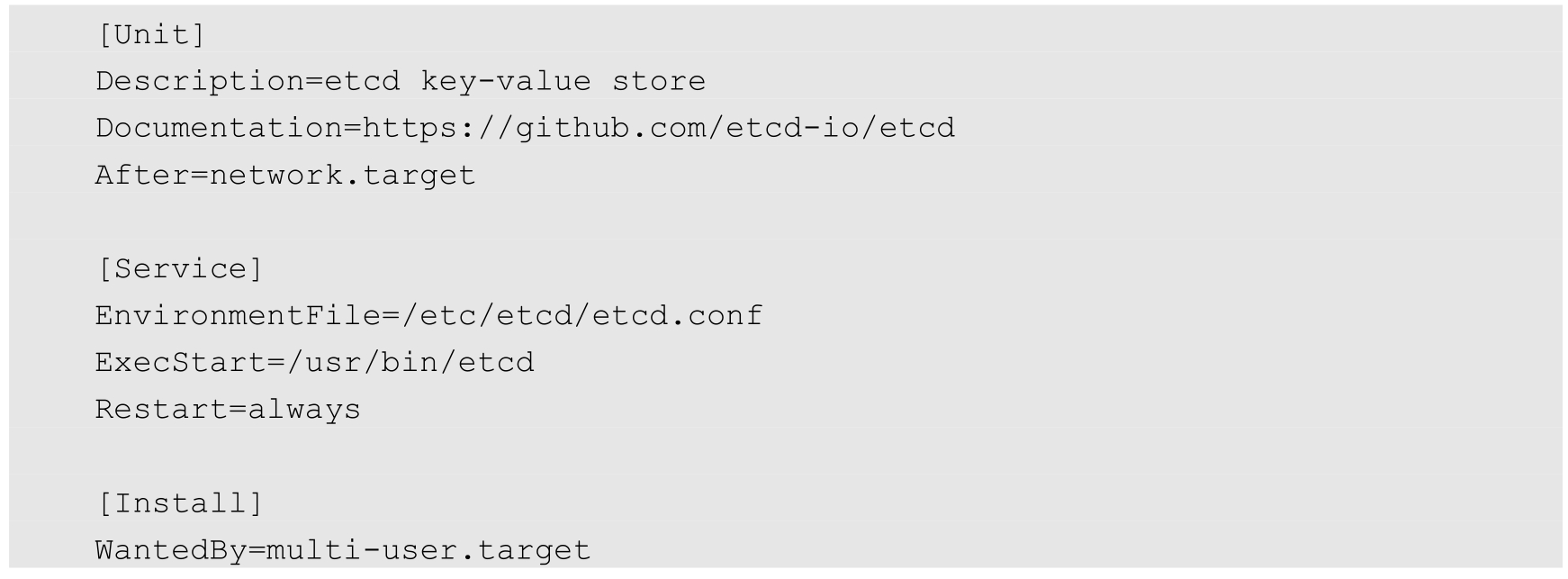 然后将其部署为一个systemd的服务,创建systemd服务配置文件/usr/lib/systemd/system/etcd.service,内容示例如下: