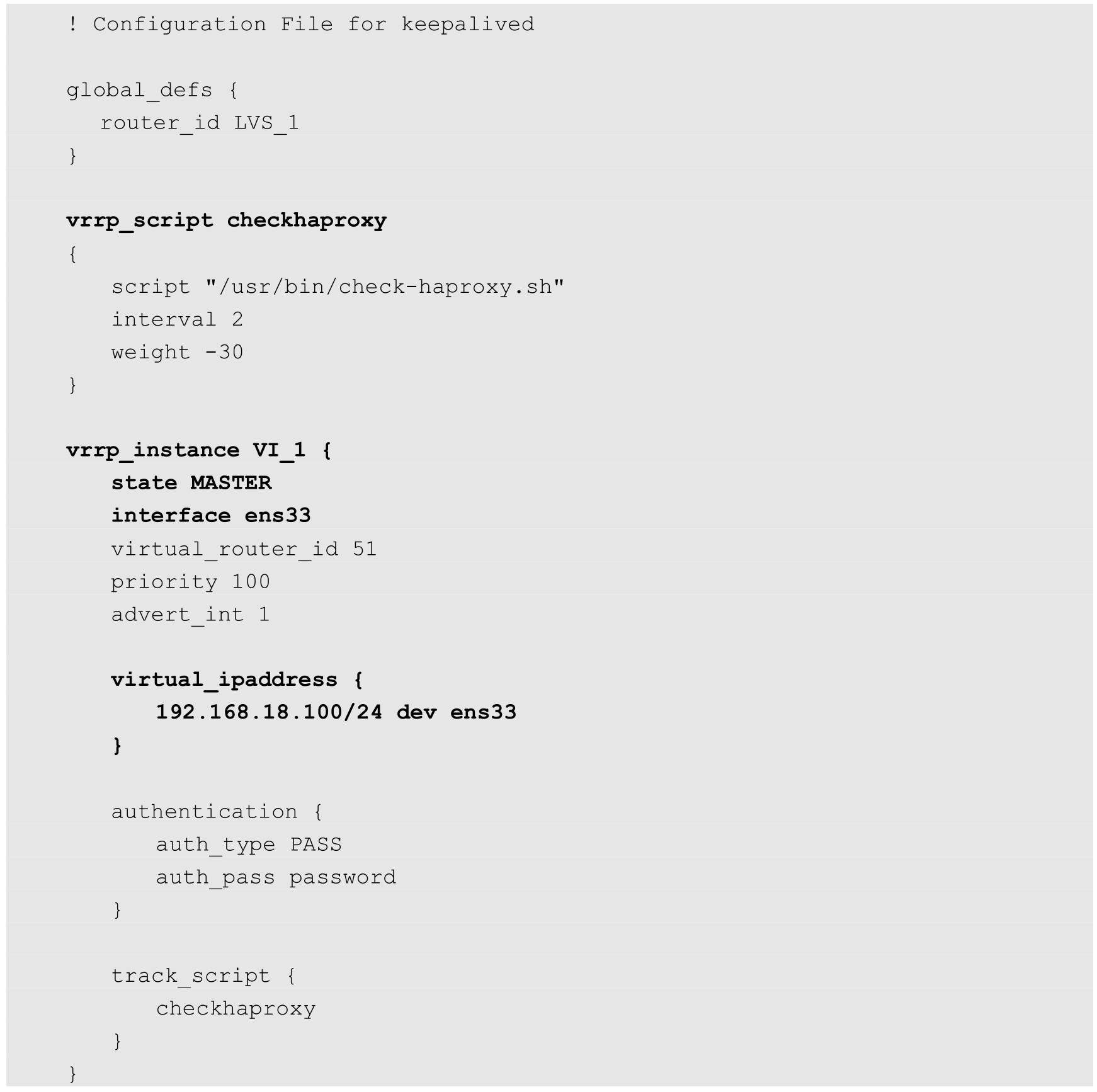 若检查成功,则应返回0;若检查失败,则返回非0值。Keepalived根据上面的配置,会每隔2s检查一次HAProxy的运行状态。例如,如果在192.168.18.3 上检查失败,keepalived就会将VIP地址切换到正常运行HAProxy的192.168.18.4服务器上,保证VIP 192.168.18.100地址的高可用。