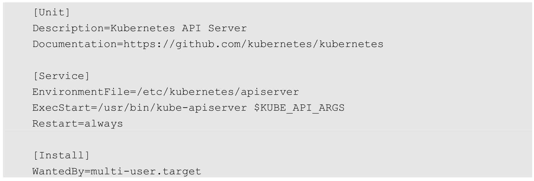 将Kubernetes的二进制可执行文件复制到/usr/bin目录下,然后在/usr/lib/systemd/system目录下为各服务创建systemd服务配置文件(完整的systemd系统知识请参考Linux的相关手册),这样就完成了软件的安装。