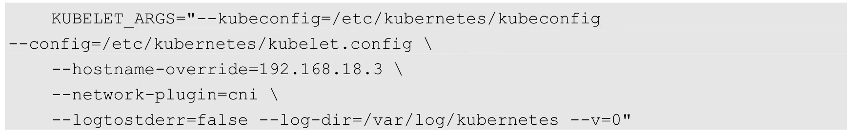 (2)配置文件/etc/kubernetes/kubelet的内容为通过环境变量KUBELET_ARGS设置的kubelet的全部启动参数,示例如下: