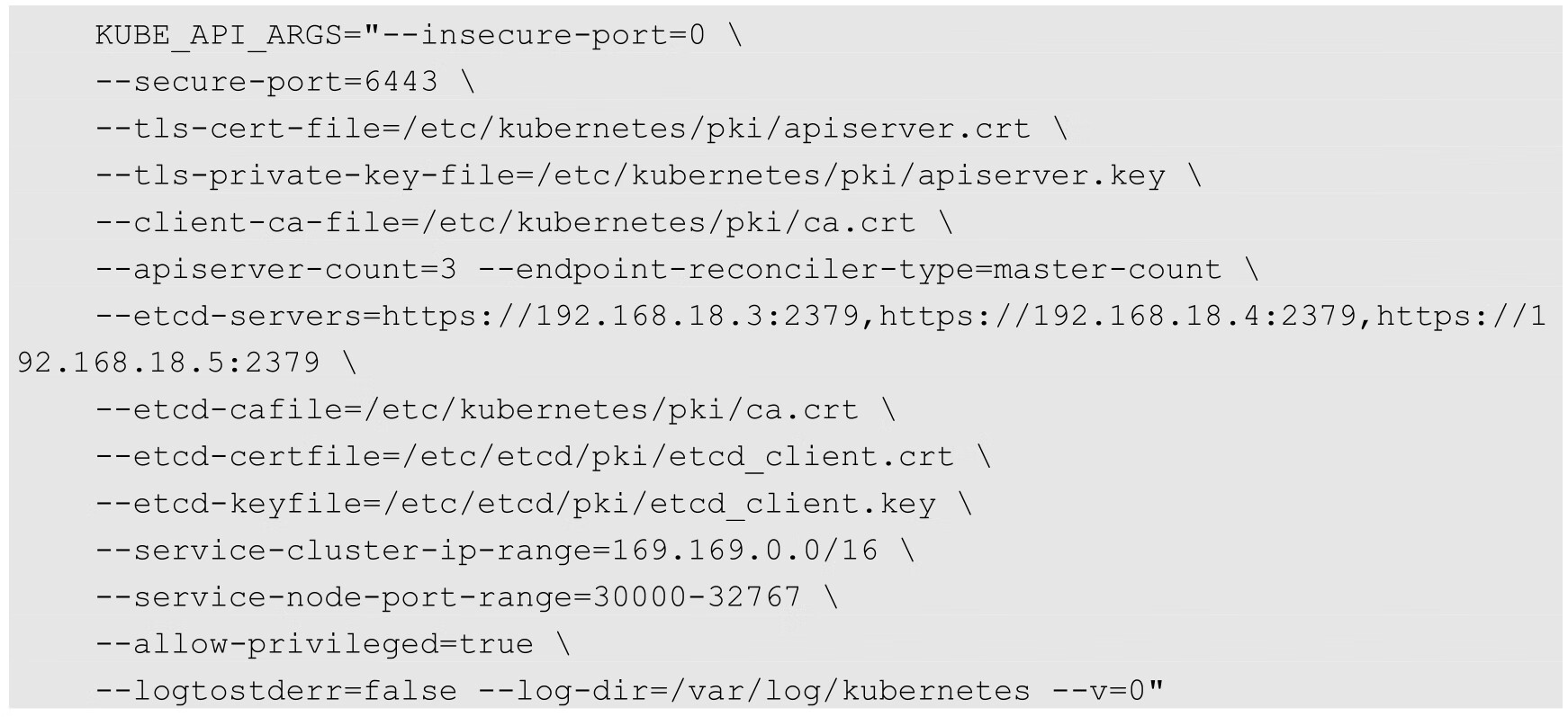 ◎ --etcd-servers:连接etcd的URL列表,这里使用HTTPS,例如https://192.168.18.3:2379、https://192.168.18.4:2379和https://192.168.18.5:2379。