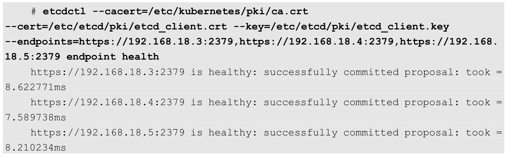 然后用etcdctl客户端命令行工具携带客户端CA证书,运行etcdctl endpoint health命令访问etcd集群,验证集群状态是否正常,命令如下: