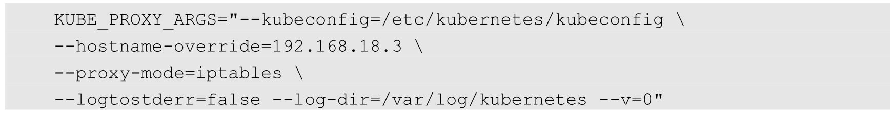 (2)配置文件/etc/kubernetes/proxy的内容为通过环境变量KUBE_PROXY_ARGS设置的kube-proxy的全部启动参数,示例如下: