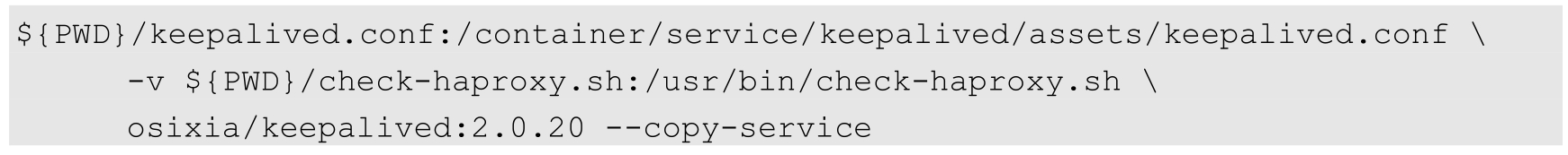 下面以Docker容器方式运行HAProxy且镜像使用osixia/keepalived为例进行说明。在两台服务器192.168.18.3和192.168.18.4上启动HAProxy,将配置文件keepalived.conf挂载到容器的/container/service/keepalived/assets目录下,启动命令如下: