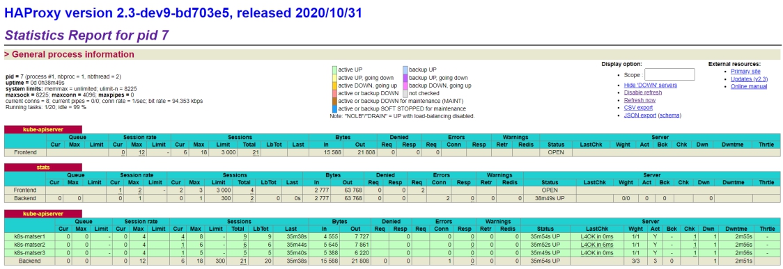 这里主要关注最后一个表格,其内容为haproxy.cfg配置文件中backend配置的3个kube-apiserver地址,它们的状态均为“UP”,表示与3个kube-apiserver服务成功建立连接,说明HAProxy工作正常。
