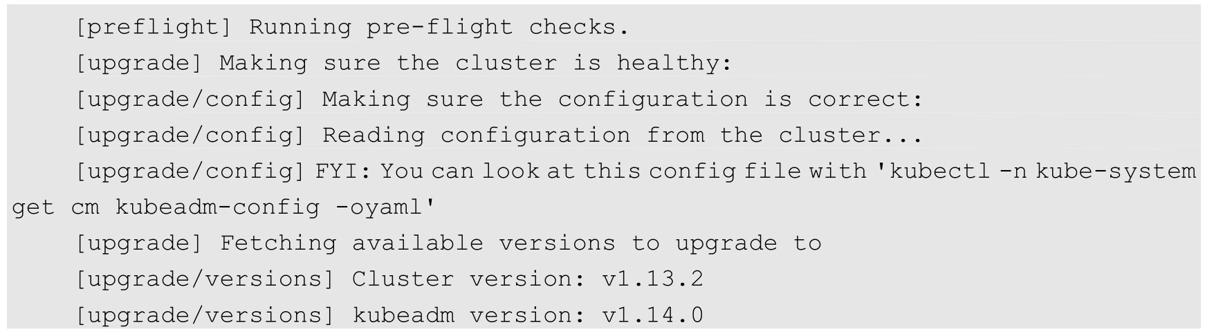 kubeadm提供了upgrade命令用于对kubeadm安装的Kubernetes集群进行升级。这一功能提供了从1.10到1.11、从1.11到1.12、从1.12到1.13及从1.13到1.14升级的能力,本节以从1.13到1.14升级为例进行说明。