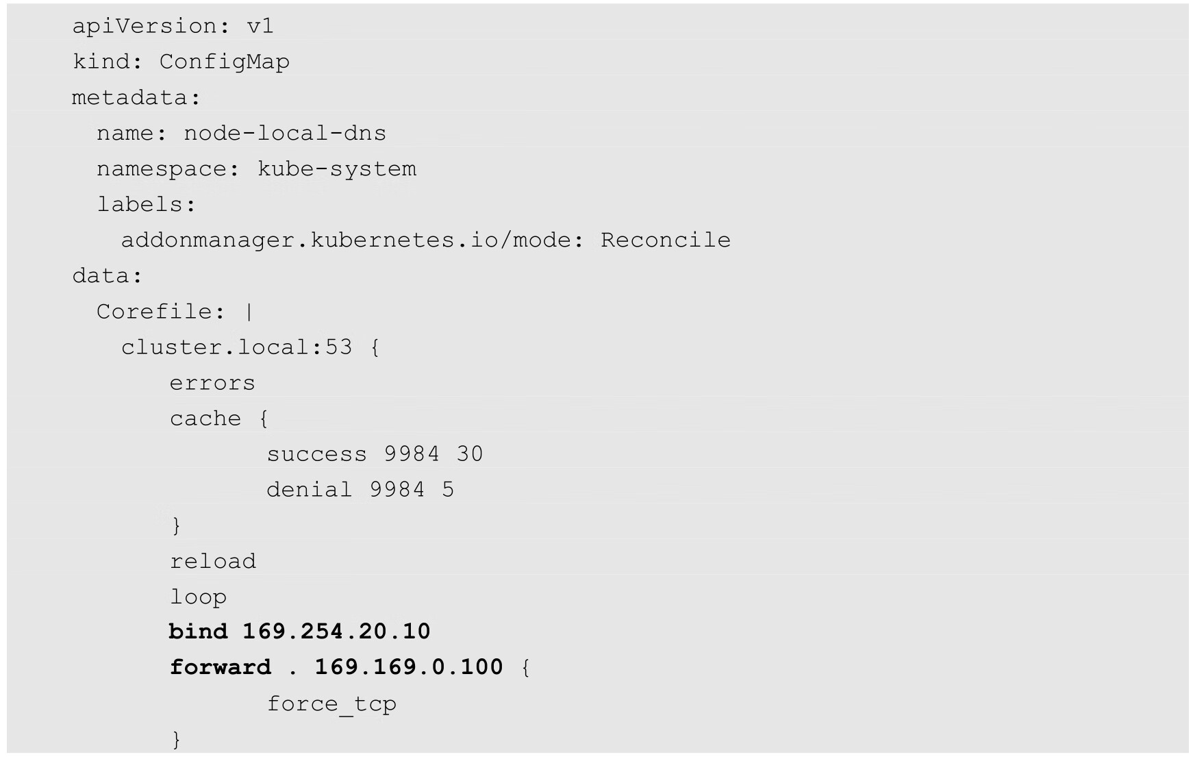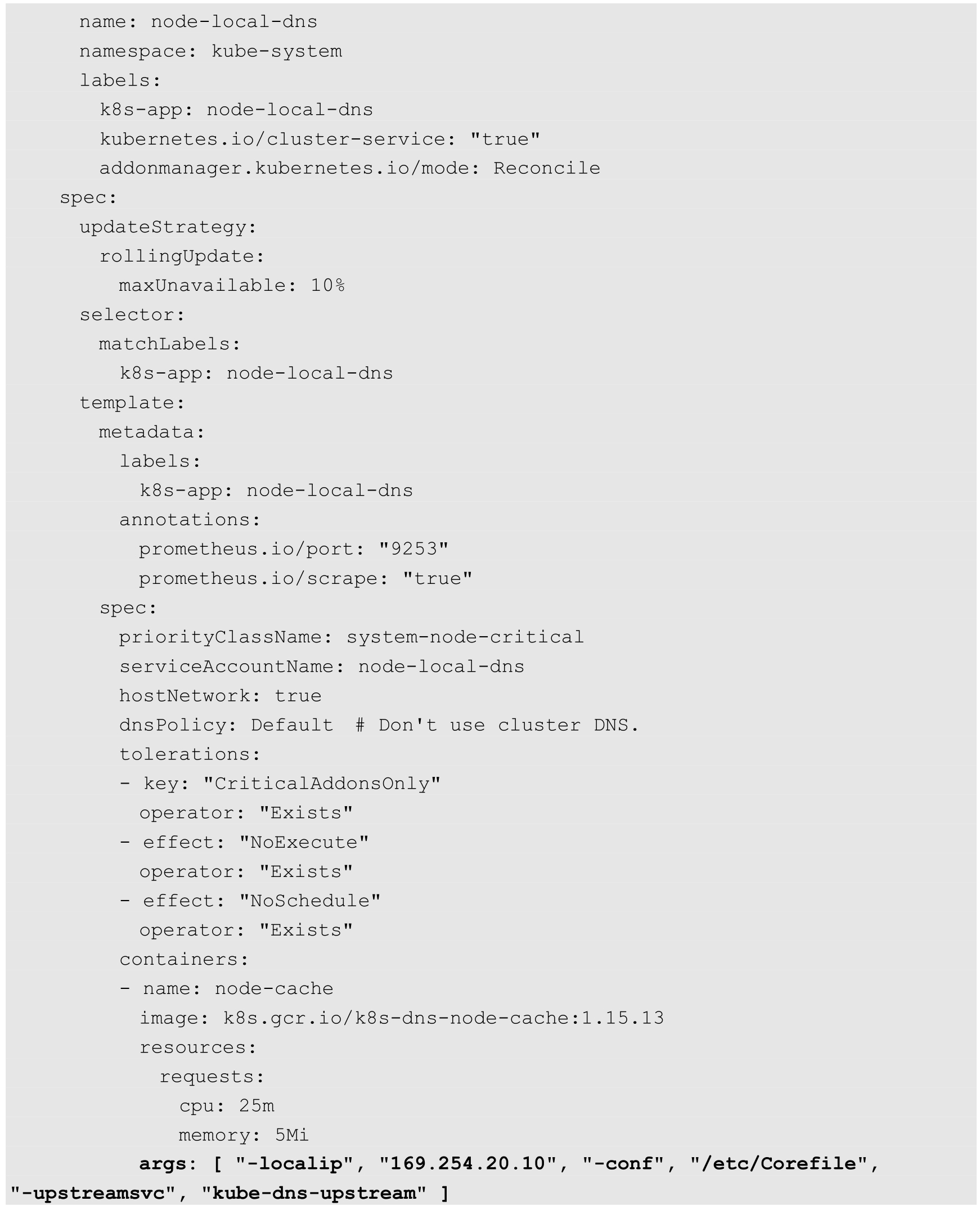 ◎ args:["-localip","169.254.20.10","-conf","/etc/Corefile","-upstreamsvc","kube-dns-upstream"]:将-localip参数设置为node-local-dns绑定的本地IP地址,对其他参数无须修改。
