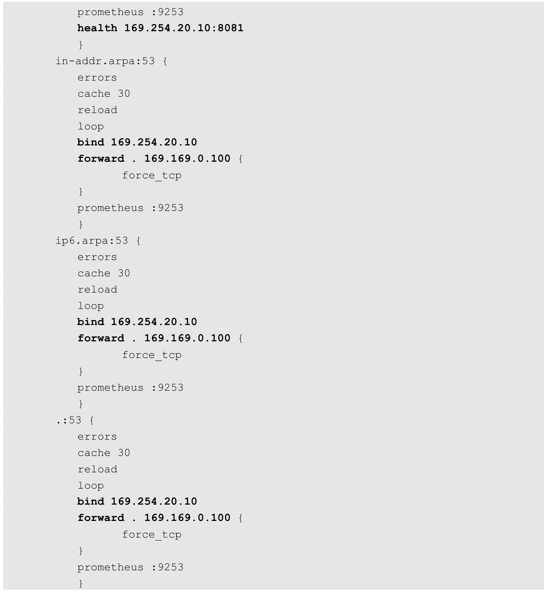 ◎ health 169.254.20.10:8081:健康检查端口号设置,与Daemonset的livenessProbe一致,需要注意,node-local-dns网络模式设置了hostNetwork=true,这个端口号也会被直接绑定到宿主机上,需要确保不与宿主机的其他应用冲突。