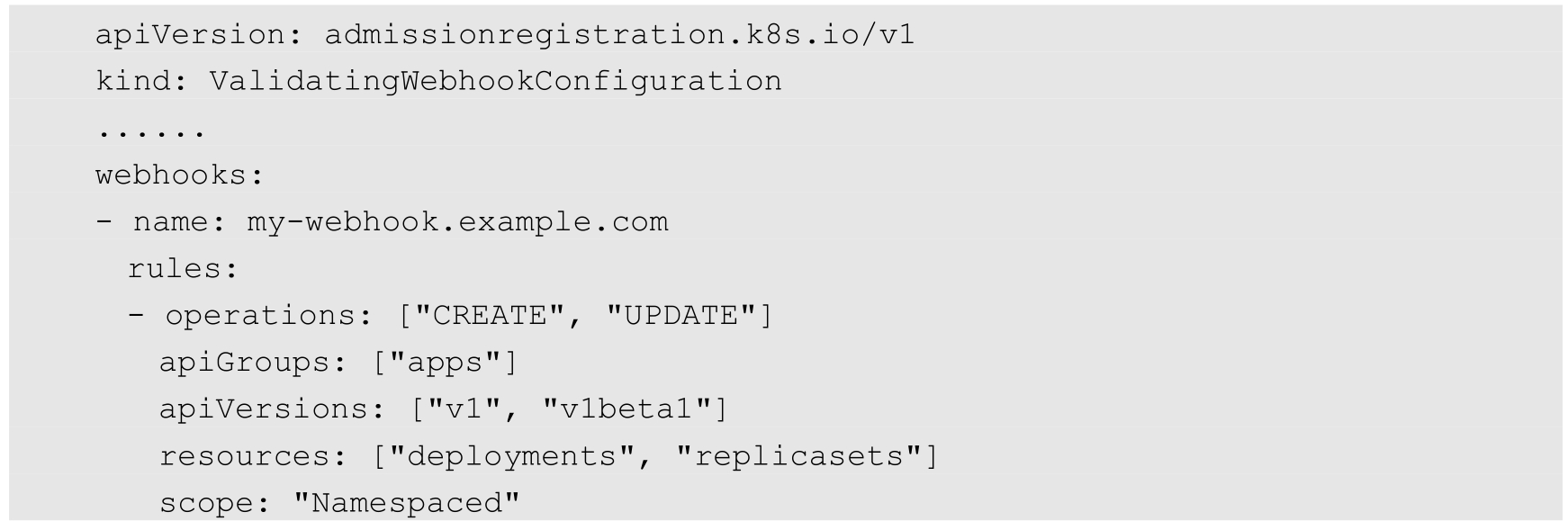 使用Admission Webhook实现准入控制的方式还有一个明显优势,即我们可以灵活指定访问哪些版本的资源对象需要通过Admission Webhook进行判断。比如下面这段配置表明 my-webhook.example.com这个Webhook只针对apps/v1及apps/v1beta1版本下的Deployments与Replicasets资源对象的CREATE与UPDATE操作进行控制。