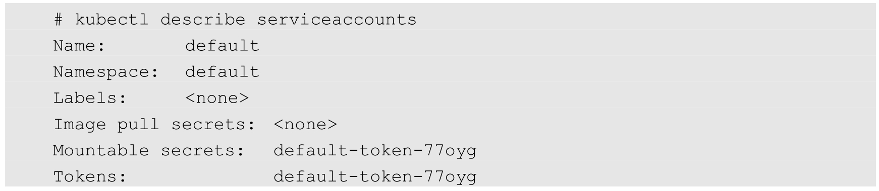 首先,查看系统中的Service Account对象,看到有一个名为default的Service Account对象,包含一个名为default-token-77oyg的Secret,这个Secret同时是Mountable secrets,表明它是需要被挂载到Pod上的: