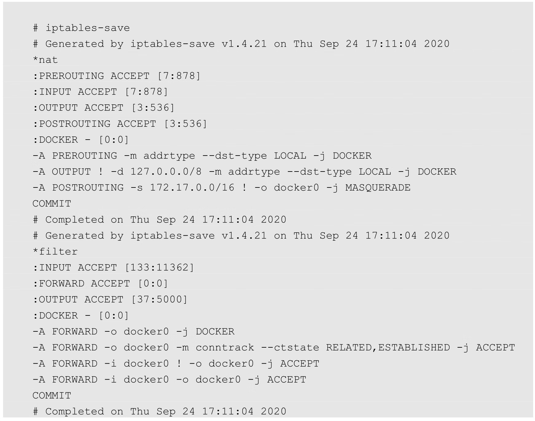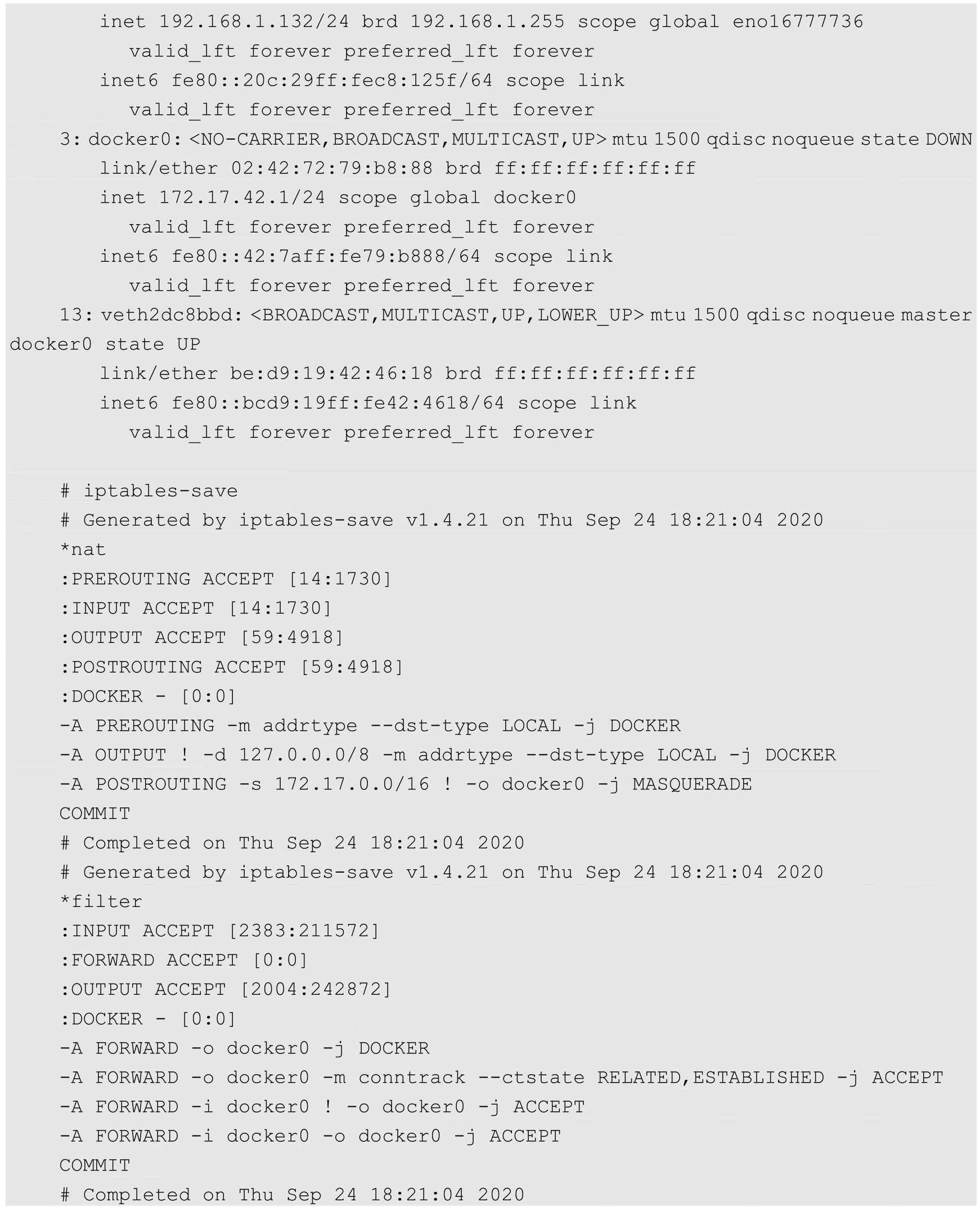 (1)宿主机器上的Netfilter和路由表都没有变化,说明在不进行端口映射时,Docker的默认网络是没有特殊处理的。相关的NAT和FILTER这两个Netfilter链还是空的。