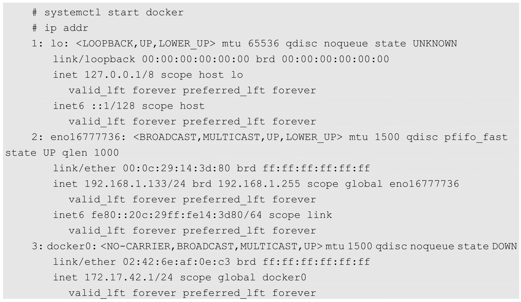 在刚刚启动Docker Daemon并且还没有启动任何容器时,网络协议栈的配置如下: