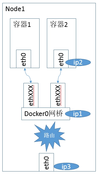 其中ip1是网桥的IP地址,Docker Daemon会在几个备选地址段里给它选一个地址,通常是以172开头的一个地址,这个地址和主机的IP地址是不重叠的。ip2是Docker在启动容器时在这个地址段选择的一个没有使用的IP地址,它被分配给容器,相应的MAC地址也根据这个IP地址,在02:42:ac:11:00:00和02:42:ac:11:ff:ff的范围内生成,这样做可以确保不会有ARP冲突。