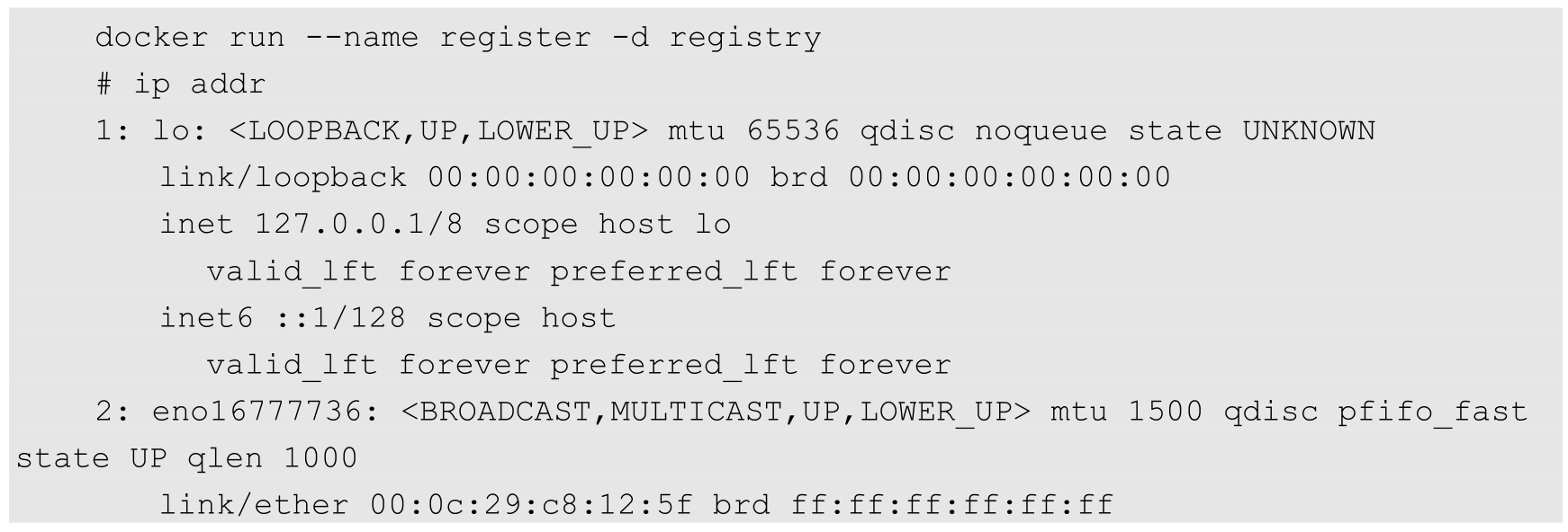 刚才查看了Docker服务启动后的网络配置。现在启动一个Registry容器(不使用任何端口镜像参数),看一下网络堆栈部分相关的变化: