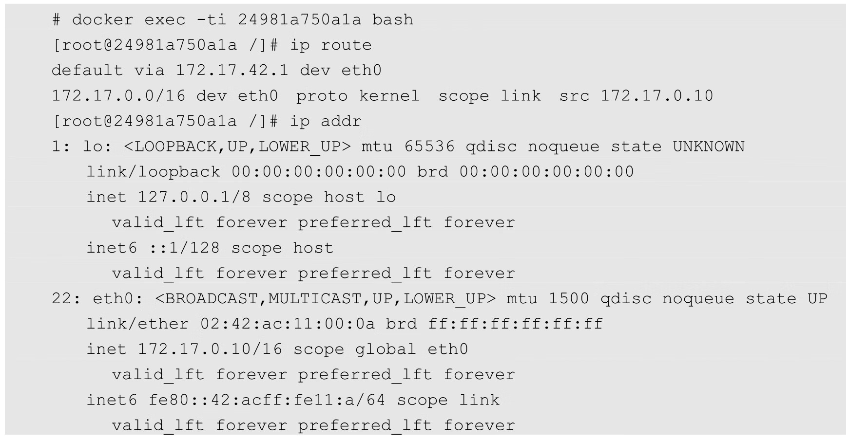 我们再次进入刚刚启动的容器内,看看网络栈是什么情况。容器内部的IP地址和路由如下: