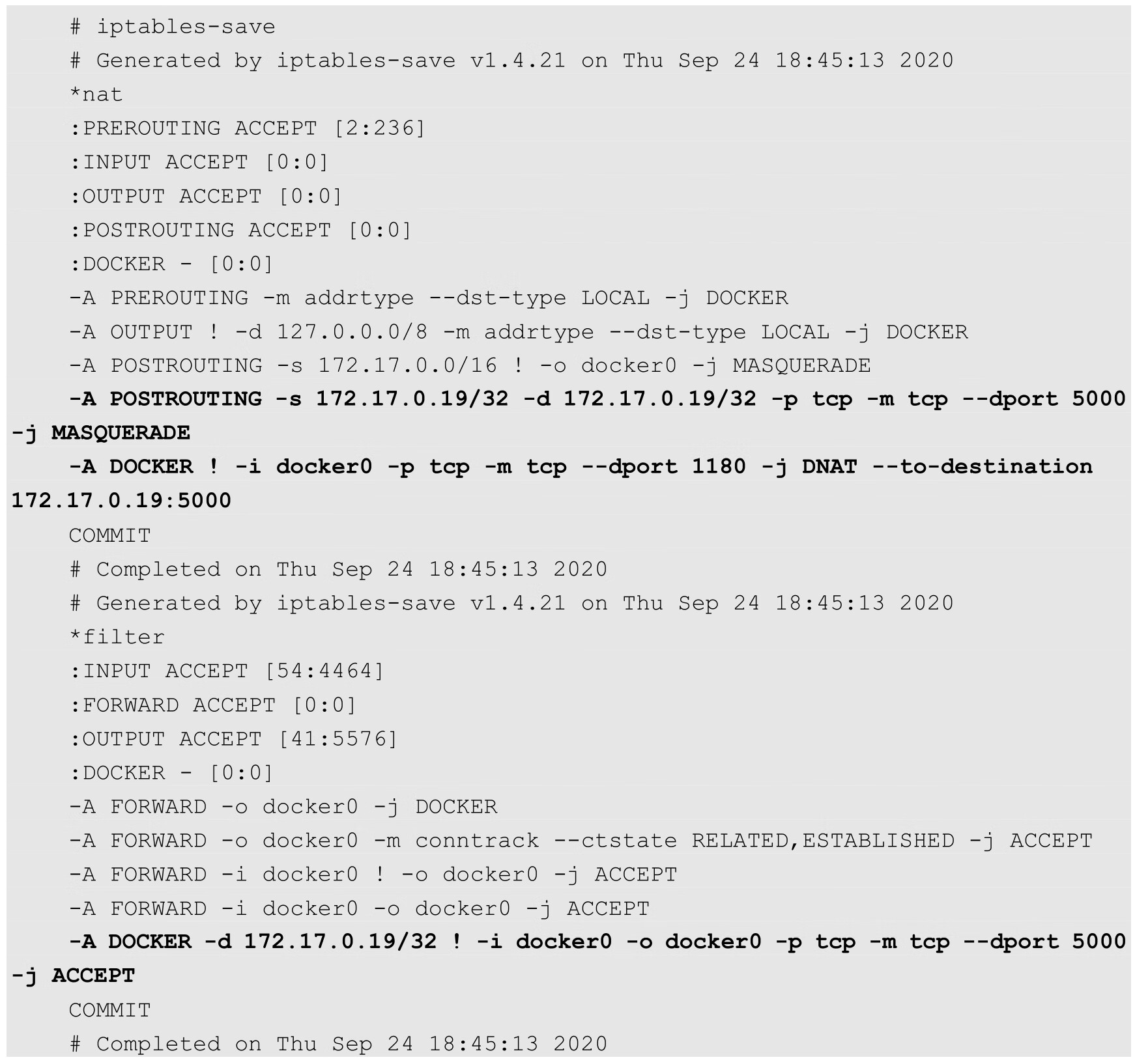 从新增的规则可以看出,Docker服务在NAT和FILTER两个表内添加的两个DOCKER子链都是给端口映射用的。在本例中,我们需要把外面宿主机的 1180 端口映射到容器的5000端口。通过前面的分析,我们知道,无论是宿主机接收到的还是宿主机本地协议栈发出的,目标地址是本地IP地址的包都会经过NAT表中的DOCKER子链。Docker为每一个端口映射都在这个链上增加了到实际容器目标地址和目标端口的转换。