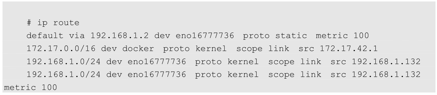 路由信息表包含一条到docker0的子网路由和一条到docker0的默认路由。