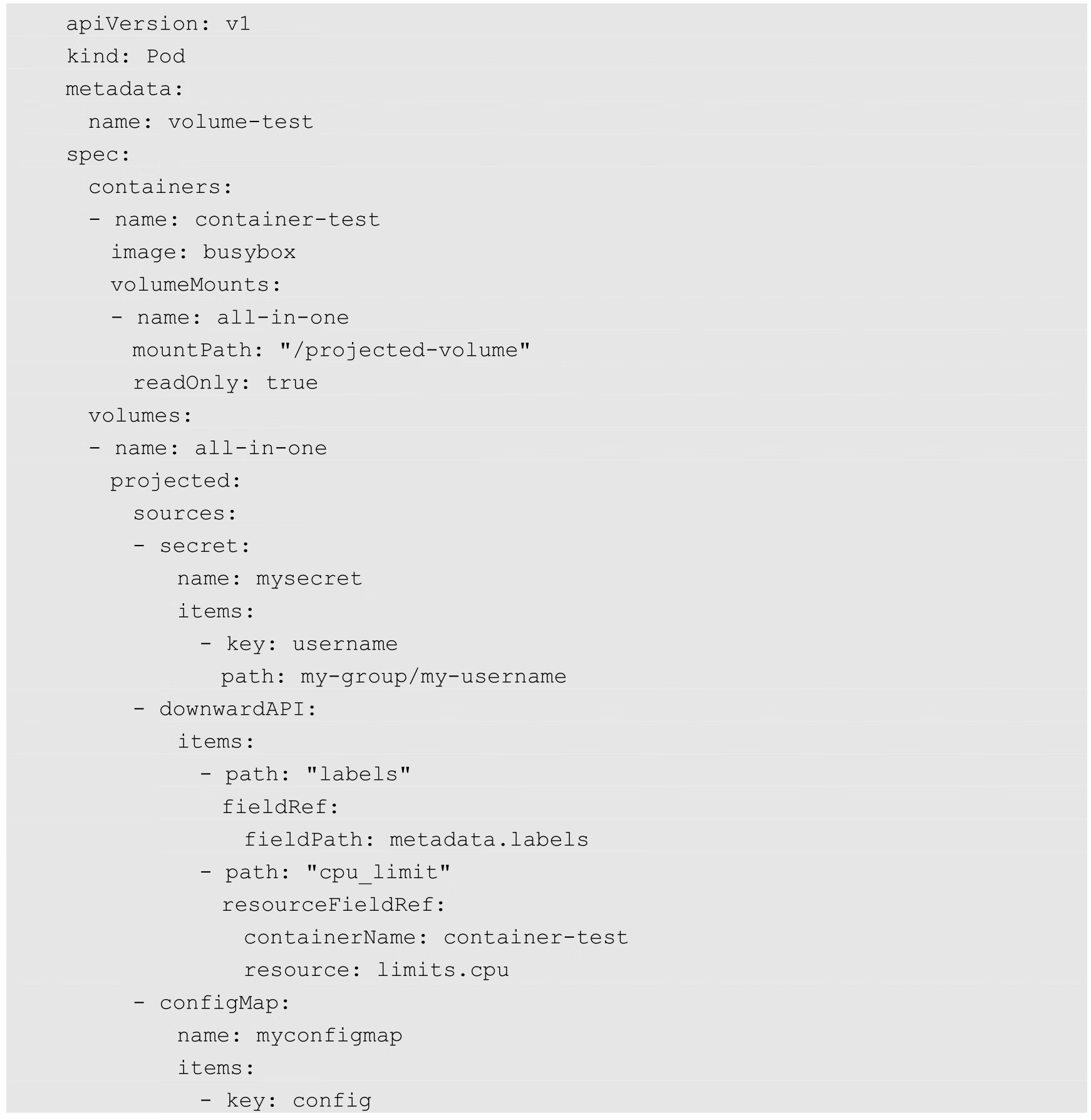 下面是一个使用Projected Volume挂载ConfigMap、Secret、Downward API共3种资源的示例: