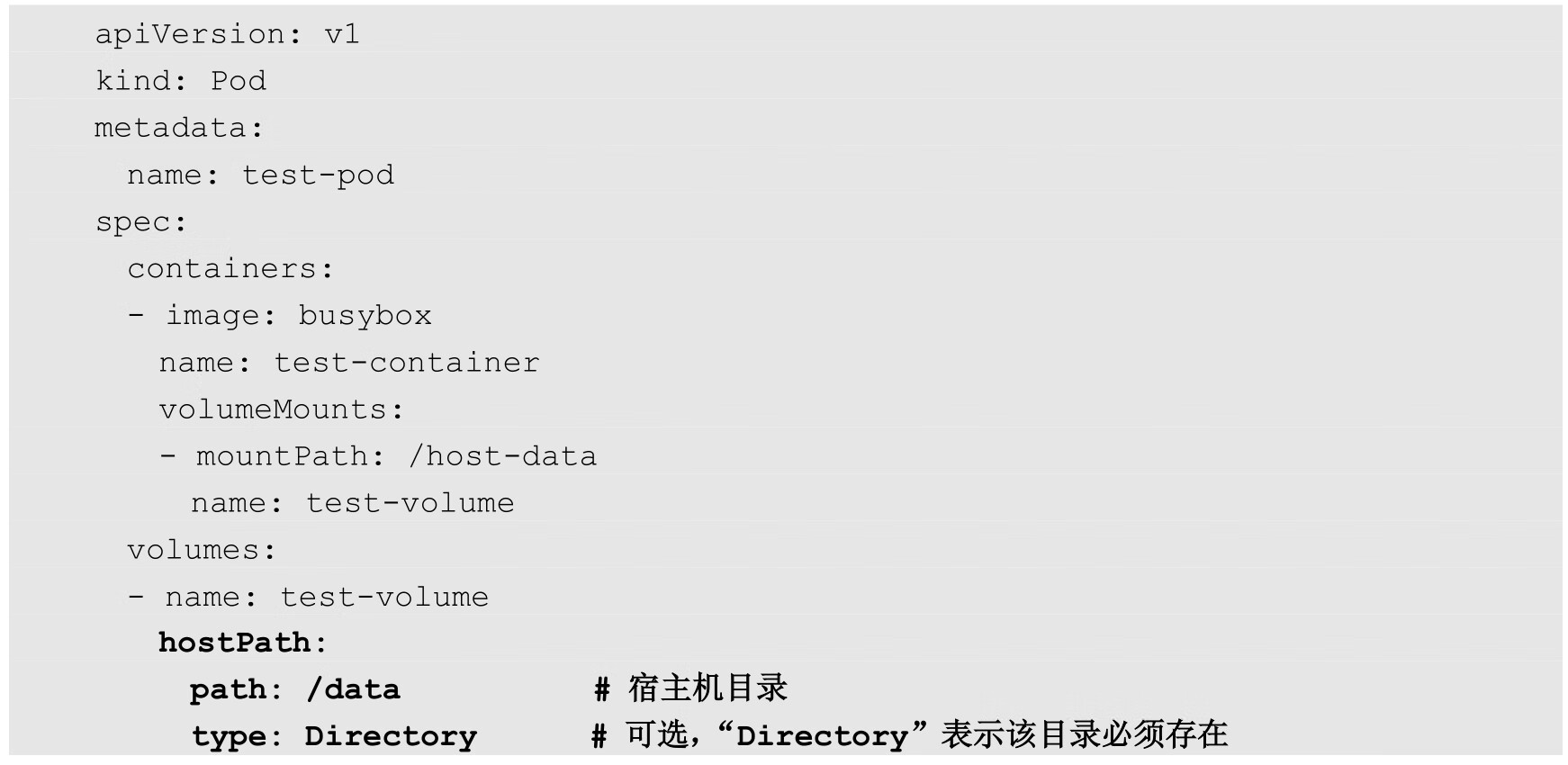 下面是使用HostPath类型的存储卷的Pod的YAML配置示例,其中将宿主机的/data目录挂载为容器内的/host-data目录:
