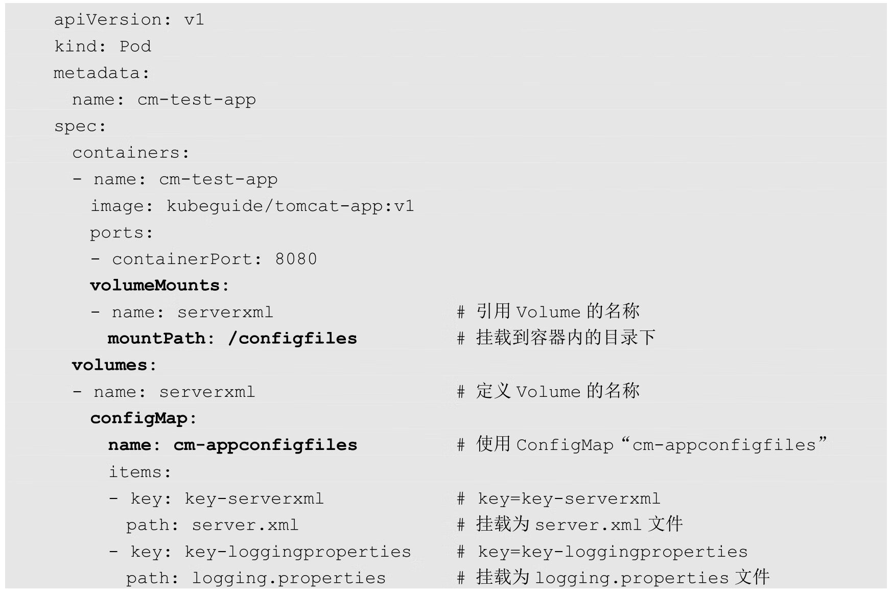 在Pod的YAML配置中,可以将ConfigMap设置为一个Volume,然后在容器中通过volumeMounts将ConfigMap类型的Volume挂载到/configfiles目录下:
